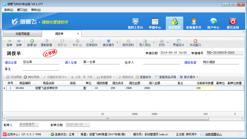 信管飛RMS及信管飛倉庫管理軟件都支持調撥單,調撥單主要用于庫存商品在各倉庫之間的調貨。調撥分為同價調撥和變價調撥兩種,其中同價調撥方式,商品的成本價以調出倉庫的成本價為準;變價調撥(或稱“異價調撥”),商品的成本價可進行修改,一般用于分攤運費/裝卸費等運輸費用。總部到門店的調撥一般采用變價調撥。 在功能導航窗點“倉庫管理”—》“調撥單”,即可進入商品調撥單操作界面,如下圖所示: 同價調撥:同價調撥單即商品移庫,是將商品從一個倉庫轉移到另一個倉庫的過程。同價調撥單不產生調撥費用,或調撥