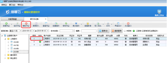 信管飛出納記賬軟件標準版和專業版在新增保存日記賬憑證后都可以直接審核憑證,憑證審核后,不允許直接刪除。客戶如果需要刪除已審核的憑證,需要先反審憑證,再進行刪除。下面我們介紹一下在信管飛出納記賬軟件專業版中如何刪除已審核的日記賬憑證? 在功能導航窗點“出納管理”—》“銀行日記賬”即可進入“銀行日記賬”界面,對“已審核”的憑證進行刪除時,系統會提示“當前憑證已審核,無法執行刪除操作!”,如圖1所示。圖1 在銀行日記賬列表界面,如圖2所示,點擊“更多操作”——》“反審憑證”,系統彈出提示信息