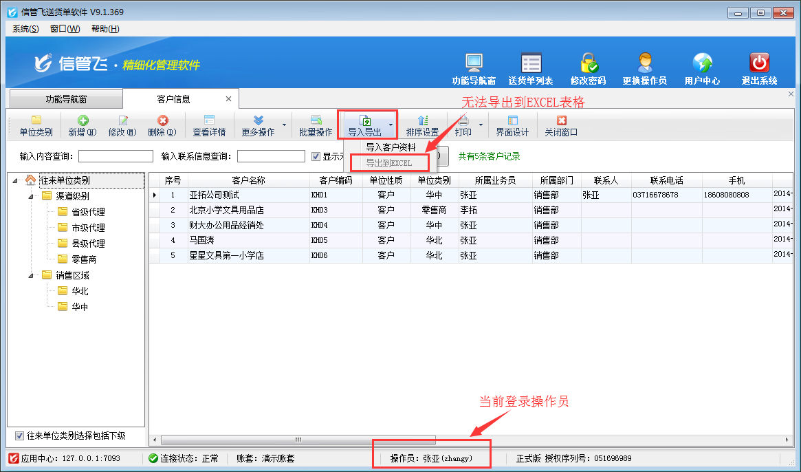 信管飛送貨單軟件、信管飛RMS、信管飛倉庫管理軟件等都支持管理基礎(chǔ)資料信息和允許設(shè)置多個(gè)操作員進(jìn)行登錄軟件。軟件支持將基礎(chǔ)資料信息以EXCEL的形式導(dǎo)出放到自定義的文件夾內(nèi)以供備份或保存,如果需要設(shè)置操作員不允許導(dǎo)出客戶信息,如何設(shè)置?本文以信管飛送貨單軟件為例,示范下如何設(shè)置操作員不可導(dǎo)出客戶信息。 在功能導(dǎo)航窗點(diǎn)擊“系統(tǒng)管理”—》“操作員及授權(quán)”打開操作員管理及授權(quán)界面,選擇操作員“張亞”,在功能模塊權(quán)限界面,選擇“基礎(chǔ)資料”—》“客戶信息”,在導(dǎo)出權(quán)限下,把客戶信息“導(dǎo)出”權(quán)限勾選取消后保存權(quán)限,如下圖1所示:圖1