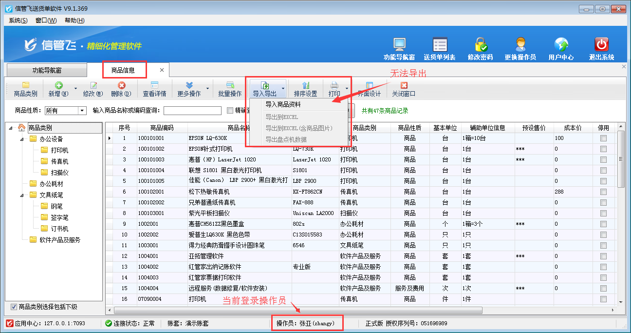 信管飛送貨單軟件、信管飛RMS、信管飛倉庫管理軟件等都支持管理基礎(chǔ)資料信息和允許設(shè)置多個(gè)操作員進(jìn)行登錄軟件。軟件支持將基礎(chǔ)資料信息以EXCEL的形式導(dǎo)出放到自定義的文件夾內(nèi)以供備份或保存,如果需要設(shè)置操作員不允許導(dǎo)出商品信息,如何設(shè)置?本文以信管飛送貨單軟件為例,示范下如何設(shè)置操作員不可導(dǎo)出商品信息。 在功能導(dǎo)航窗點(diǎn)擊“系統(tǒng)管理”—》“操作員及授權(quán)”打開操作員管理及授權(quán)界面,選擇操作員“張亞”,在功能模塊權(quán)限界面,選擇“基礎(chǔ)資料”—》“商品信息”,在導(dǎo)出權(quán)限下,把商品信息“導(dǎo)出”權(quán)限勾選取消后保存權(quán)限,如下圖1所示:圖1