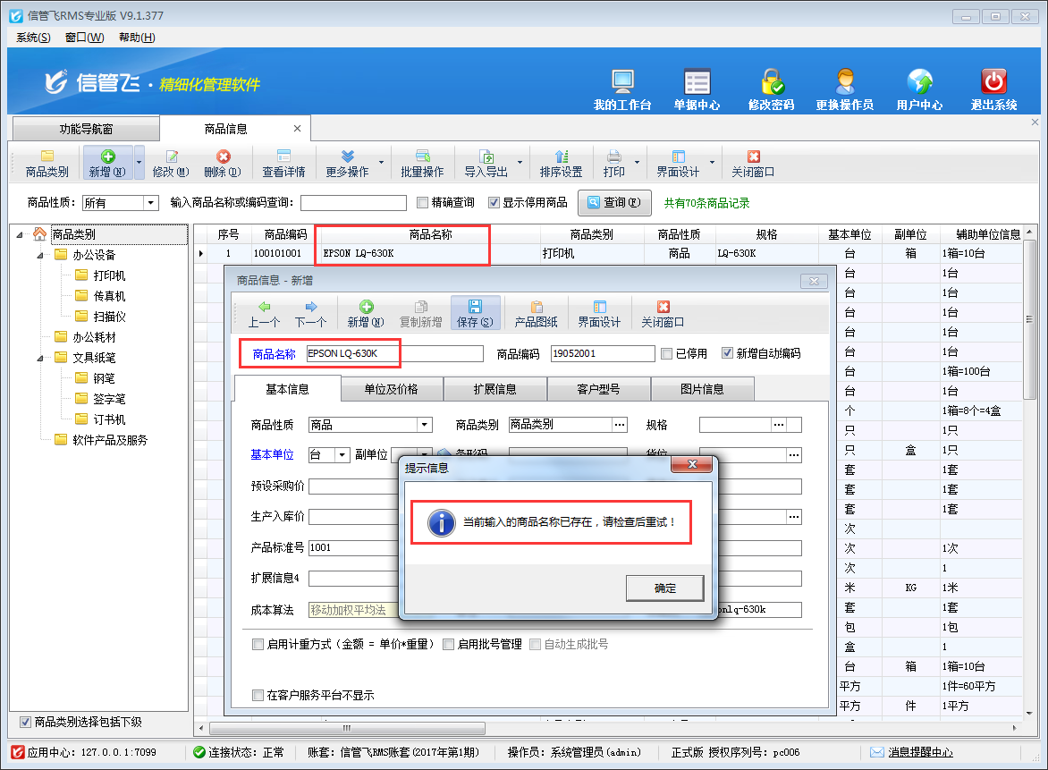 亞拓軟件自主研發(fā)的信管飛RMS、信管飛送貨單軟件、信管飛倉庫管理軟件等都支持新增商品信息,為了避免增加的商品信息出現(xiàn)重復(fù),軟件支持參數(shù)設(shè)置商品名稱不可重復(fù)。 以信管飛RMS為例,在系統(tǒng)管理—》系統(tǒng)參數(shù)配置—》業(yè)務(wù)參數(shù)內(nèi)將“數(shù)據(jù)可否重復(fù)參數(shù)”中的“商品名稱可重復(fù)”參數(shù)的勾選取消,然后保存設(shè)置。如下圖所示: 設(shè)置完成后,打開功能導(dǎo)航窗的“基礎(chǔ)資料”—》“商品信息”,新增一個(gè)商品,輸入和之前已有商品一樣的名稱,保存時(shí)系統(tǒng)會(huì)提示“當(dāng)前輸入的商品名稱已存在,請(qǐng)檢查后重試!”,如下圖所示:&nbs