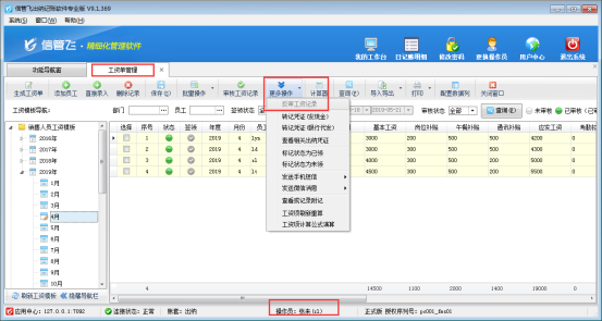 信管飛出納記賬軟件專業(yè)版,支持設(shè)置工資模板來管理員工工資單,為了避免操作員修改工資單,軟件中可以設(shè)置操作員的工資單不可反審修改權(quán)限。下邊我們?cè)谲浖惺痉断氯绾卧O(shè)置操作員的此權(quán)限。 用系統(tǒng)管理員賬號(hào)登錄軟件后,在“系統(tǒng)管理”—》“操作員及授權(quán)”中,選擇操作員“張來”,在功能模塊權(quán)限下選擇綜合管理工資單管理,把工資單管理的“反審修改”的權(quán)限取消勾選,然后保存權(quán)限設(shè)置,如下圖1所示: 圖1 操作員權(quán)限保存成功后,返回登錄窗口,選擇操作員“張來”登