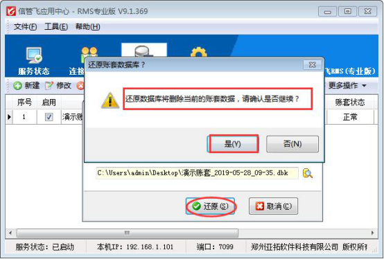亞拓軟件旗下所有軟件安裝完成后,數(shù)據(jù)備份均保存在安裝軟件目錄下的賬套文件備份文件夾中,如需要更換電腦使用,需要把最近日期的備份數(shù)據(jù)復(fù)制到新的電腦上,在新的電腦上安裝好軟件,在應(yīng)用中心程序中對(duì)之前的賬套備份數(shù)據(jù)進(jìn)行還原操作,就可以把之前的所有數(shù)據(jù)同步到這個(gè)電腦上。 本文以“信管飛RMS軟件”為例,示范如何還原備份賬套數(shù)據(jù)。 首先,復(fù)制原電腦上的備份數(shù)據(jù)到新電腦上,把備份數(shù)據(jù).dbk格式的文件復(fù)制到電腦桌面上,方便還原賬套進(jìn)行選擇。打開應(yīng)用中心程序(紅色