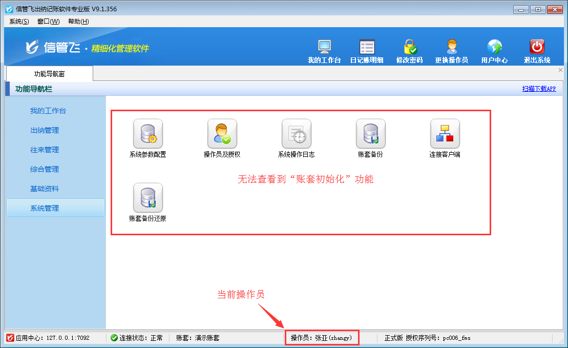 賬套初始化一般用于在正式使用軟件前,對(duì)賬套中的數(shù)據(jù)進(jìn)行初始化,以便重新錄入數(shù)據(jù)。一般在試用軟件期間會(huì)輸入一些試用的數(shù)據(jù),比如現(xiàn)金日記賬憑證、銀行日記賬憑證或一些應(yīng)收應(yīng)付款信息,當(dāng)您試用結(jié)束后想刪除這些無(wú)用的數(shù)據(jù)錄入新數(shù)據(jù)時(shí),可以通過(guò)本系統(tǒng)的“帳套初始化”功能來(lái)一次性清除,方便快捷(如下圖所示)。 執(zhí)行賬套初始化操作后,會(huì)刪除賬套內(nèi)相應(yīng)的數(shù)據(jù),因此務(wù)必提前做好備份,謹(jǐn)慎操作!為了避免操作員誤操作,導(dǎo)致數(shù)據(jù)丟失,軟件內(nèi)支持設(shè)置操作員不可進(jìn)行賬套初始化操作,下面以信管飛出納記賬軟件專(zhuān)業(yè)版為例來(lái)演示一下具體的操作步驟。