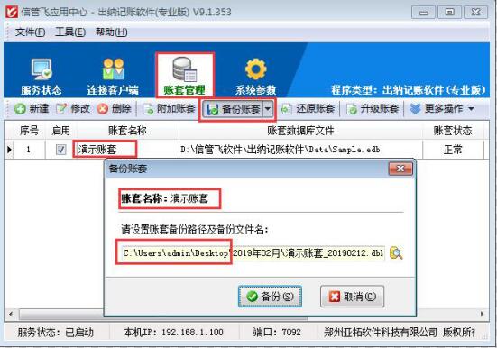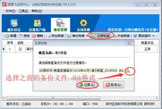 亞拓旗下所有軟件安裝完成后,數(shù)據(jù)備份均保存在安裝軟件目錄下的賬套文件備份文件夾中,如需要更換電腦使用,需要把最近日期的備份數(shù)據(jù)復(fù)制到新的電腦上,在新的電腦上安裝好軟件,在應(yīng)用中心程序中對(duì)之前的賬套備份數(shù)據(jù)進(jìn)行還原操作,就可以把之前的所有數(shù)據(jù)同步到這個(gè)電腦上。 本文章以信管飛出納記賬軟件為例,演示下如何還原賬套備份。 把備份數(shù)據(jù).dbk格式的文件復(fù)制到電腦桌面上,方便還原賬套進(jìn)行選擇。打開(kāi)應(yīng)用中心程序(紅色圖標(biāo)),在賬套管理中點(diǎn)擊賬套文件(如沒(méi)有賬套可以新建一個(gè)新的賬套),點(diǎn)擊工具欄的“