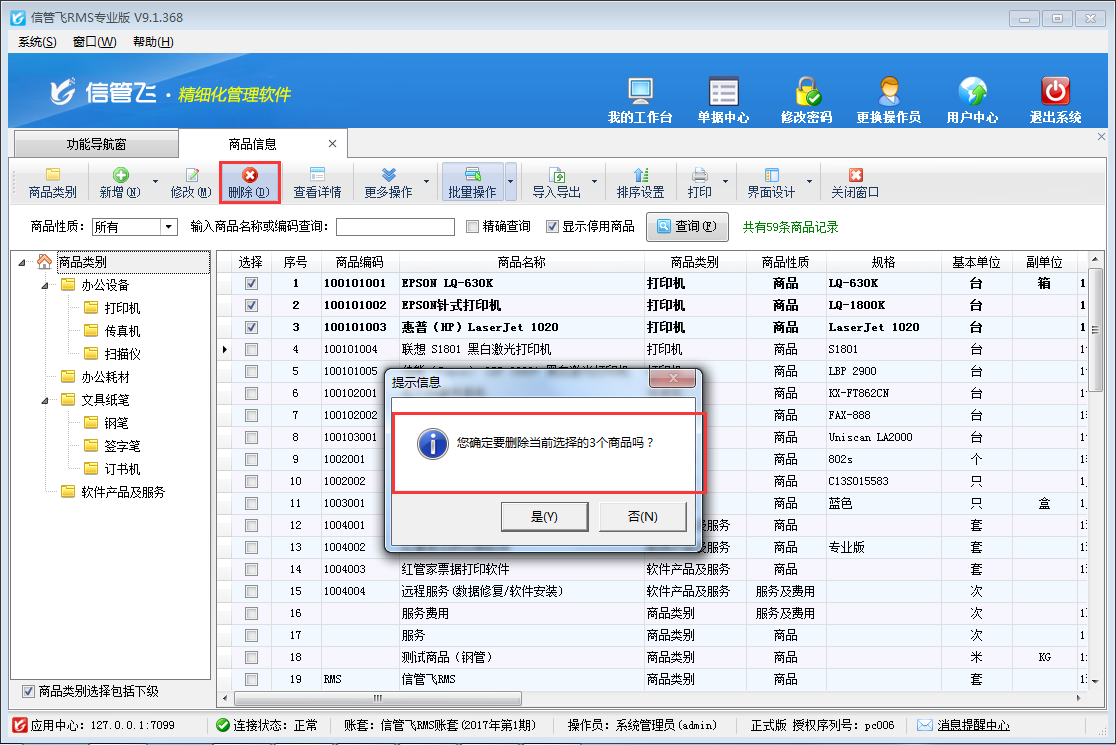 信管飛送貨單軟件、信管飛RMS等都支持維護(hù)商品信息,出現(xiàn)商品信息大范圍錄入錯(cuò)誤時(shí),軟件支持對(duì)錯(cuò)誤商品資料進(jìn)行批量刪除操作,避免一個(gè)一個(gè)刪除的麻煩。以信管飛RMS為例示范下如何操作? 在功能導(dǎo)航窗選擇“基礎(chǔ)資料”—》“商品信息”進(jìn)入商品信息管理界面,選擇工具欄的“批量操作”按鈕,進(jìn)入批量操作模式,選擇需要?jiǎng)h除的商品信息(批量操作支持全選、全不選、反選),如下圖所示: 批量選擇商品信息后,點(diǎn)擊工具欄的“刪除”按鈕,會(huì)提示“確定要?jiǎng)h除當(dāng)前選擇的商品”,點(diǎn)擊“是”進(jìn)行批量刪除操作。如下圖所示: