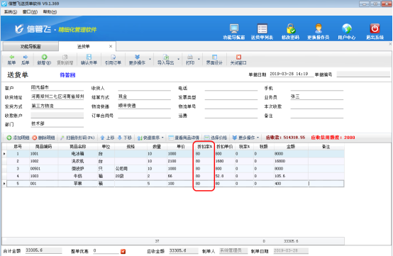 信管飛送貨單軟件、信管飛倉(cāng)庫(kù)管理軟件、信管飛RMS開(kāi)單時(shí),當(dāng)商品存在打折情況時(shí),支持錄入商品的折扣率。當(dāng)商品明細(xì)的內(nèi)容比較多時(shí),為了快速開(kāi)單,提高效率,可以批量更新單據(jù)明細(xì)中的折扣率。 下面我們以信管飛送貨單軟件為例詳細(xì)介紹下如何批量修改商品折扣率。 登錄軟件,在功能導(dǎo)航窗點(diǎn)“業(yè)務(wù)處理”—》“新開(kāi)送貨單”,進(jìn)入新開(kāi)送貨單界面,錄入商品信息,默認(rèn)的折扣率是100%,如圖1所示:圖 1 在單據(jù)明細(xì)上方,點(diǎn)擊“更多操作”—》“修改商品折扣”,彈出修改商品折