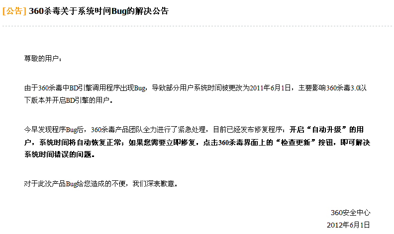 今天部分用戶反饋,新增憑證的時候,憑證的默認日期變為“2011-06-01”,導致用戶保存的時候提示憑證日期不在當前賬期,從而無法保存憑證。 解決這個問題可以通過調整系統日期實現,在桌面右下角點擊系統時間,會彈出“日期和時間 屬性”窗口,可以直接調整系統日期。如下圖所示: 經過我司技術人員密切跟蹤,發現此問題僅出現在部分安裝360殺毒軟件的機器上,初步懷疑是360查殺病毒時進行系統時間鎖定保護導致的異常。 PS:360已發布公告,確認系統時間篡改是由于360殺毒軟件的BD殺毒引擎異常導
