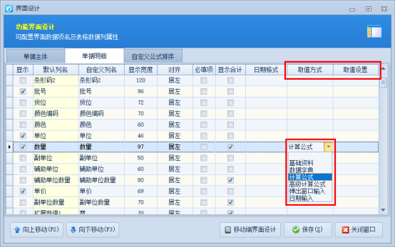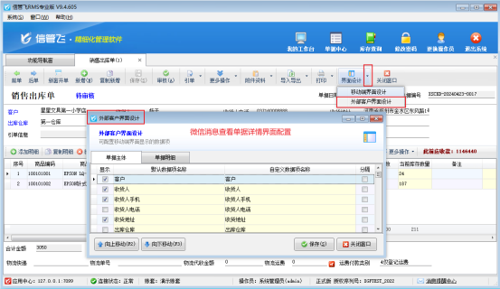 信管飛RMS軟件和信管飛倉庫管理軟件均支持界面設計,可以設置界面顯示數(shù)據項。新版本界面設計支持設置單據明細顯示配置,可選擇后控制界面顯示數(shù)據項,本文以“信管飛軟件”為例,示范如何配置? 演示視頻觀看鏈接:信管飛RMS軟件中單據明細控制功能如何使用? 以“銷售出庫單”為例,在銷售出庫單界面,點擊工具欄“界面設計”,在單據主體中,勾選顯示“擴展信息1”,向上移動位置,修改自定義列名,取值方式選擇“單據明細控制”,如下圖所示: &nb
