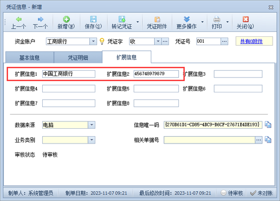 出納記賬軟件在登記出納憑證時,支持將往來單位擴展信息提取到憑證的擴展信息內顯示,有用戶需要提取往來單位的開戶銀行和銀行賬號信息到出納憑證內顯示,本篇文章介紹一下操作方法。 演示視頻觀看鏈接:登記憑證時如何調用顯示往來單位的開戶銀行和銀行賬號信息演示視頻 在功能導航窗點擊“系統管理”—》“系統參數配置”—》“業務參數”打開業務參數配置界面,然后在出納憑證相關參數中打鉤啟用“往來單位擴展信息提取到出納憑證的擴展信息”參數,參數值輸入相應提取的數據項名稱,如提取往來單位的開戶銀行和銀行賬號信