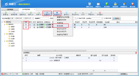 此文章相關演示視頻:信管飛RMS軟件會計憑證如何批量取消記賬演示視頻 信管飛RMS專業版包含財務處理功能可用來登記會計憑證,有用戶在記賬之后需要修改憑證,已過賬狀態下無法進行修改,需要先把憑證取消記賬后才能進行反審修改,如果需要修改的已過賬憑證過多,一個一個取消記賬過于麻煩,軟件內支持在會計憑證列表批量取消記賬,本篇文章介紹下如何操作。 在軟件內點擊“賬務處理”—》“會計憑證”,可打開會計憑證列表界面