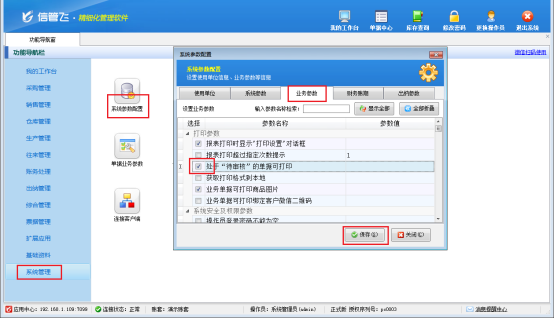 此文章相關演示視頻:處于“待審核”狀態的單據打印不了,如何解決演示視頻 信管飛倉庫軟件、信管飛RMS軟件等默認開單保存后即可打印,部分用戶在打印單據時可能會出現已審核單據可正常進行打印,待審核單據打印不了的情況,如何解決呢?本篇文章以“信管飛RMS”為例介紹下如何設置待審核單據也可進行打? 打開一個待審核單據,打印按鈕顯示灰色,無法進行打印: 在功能導航窗點擊“系統管理”—》“系統參數配置”—》“業務