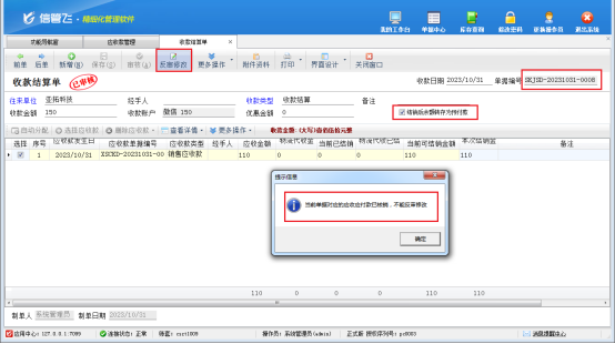 此文章相關演示視頻:反審修改收款結算單時提示對應的應收應付款已核銷,如何解決演示視頻 信管飛RMS、信管飛出納記賬軟件、信管飛送貨單軟件均支持管理往來賬款,在進行收款結算后可能會出現收款金額有誤,需要反審修改結算單的情況,部分用戶在反審修改結算單時可能會出現以下提示:“當前單據對應的應收應付款已核銷,不能反審修改”,如圖: 出現以上提示是由于此收款結算單結銷余額轉存生成的預付款有結銷導致的,需要查找到此收款結算單結銷余額轉存生成的預付款,然后將此收