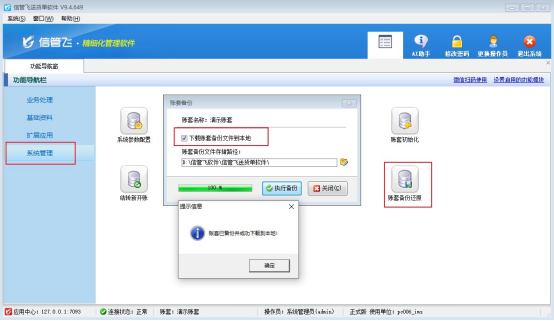 信管飛軟件旗下所有產(chǎn)品均支持云賬套模式,數(shù)據(jù)存儲于云端,用戶在本地連接網(wǎng)絡(luò)時,通過賬號密碼即可直接訪問數(shù)據(jù)。系統(tǒng)默認(rèn)每天自動在云端備份數(shù)據(jù),若需將備份數(shù)據(jù)存儲到本地,可按以下步驟下載: 演示視頻:如何解決云賬套備份下載至本地?zé)o法直接還原問題? 在功能導(dǎo)航窗點(diǎn)擊 “系統(tǒng)管理”,打開賬套備份還原界面,點(diǎn)擊 “執(zhí)行備份”,選擇目標(biāo)備份文件后下載即可(操作界面如下圖所示)。 部分用戶反饋,下載后的備份文件無法直