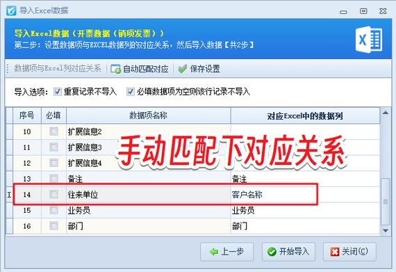 在企業(yè)的采購與銷售流程中,發(fā)票管理至關(guān)重要。信管飛出納記賬軟件憑借其強(qiáng)大的發(fā)票管理功能,助力企業(yè)高效、精準(zhǔn)地處理發(fā)票信息。另外,軟件支持導(dǎo)入Excel快速導(dǎo)入發(fā)票信息。有用戶在軟件內(nèi)導(dǎo)出銷項(xiàng)發(fā)票Excel模版,維護(hù)數(shù)據(jù)后導(dǎo)入軟件,客戶名稱這一項(xiàng)導(dǎo)入不成功,如下圖所示。 出現(xiàn)以上問題的原因是:表格內(nèi)“客戶名稱”和軟件內(nèi)“往來單位”名稱不一致,自動匹配對應(yīng)關(guān)系時,無法自動匹配上。 需要手動匹配一下軟件內(nèi)數(shù)據(jù)項(xiàng)與Excel數(shù)據(jù)列的對應(yīng)關(guān)系,對應(yīng)關(guān)系設(shè)置完成后,重新導(dǎo)入,即可導(dǎo)入成功。&nbs