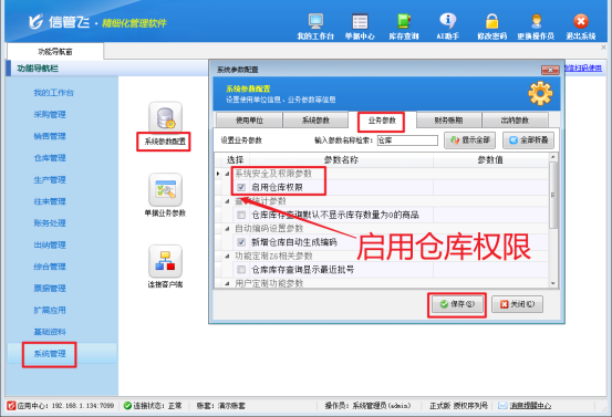 在使用信管飛軟件進(jìn)行新增倉庫時,是否遇到過這樣的困擾:操作員在倉庫信息界面新增了倉庫,卻發(fā)現(xiàn)新增的倉庫信息如同“石沉大海”,根本無法顯示,這嚴(yán)重影響了工作效率,出現(xiàn)這種問題的主要原因在于該操作員賬號沒有分配到倉庫權(quán)限導(dǎo)致的,本篇文章介紹下如何解決? 首先,切換系統(tǒng)管理員登錄,功能導(dǎo)航窗點(diǎn)擊“系統(tǒng)管理”—》“系統(tǒng)參數(shù)配置”—》“業(yè)務(wù)參數(shù)”進(jìn)入業(yè)務(wù)參數(shù)配置界面,在系統(tǒng)安全及權(quán)限參數(shù)中勾選“啟用倉庫權(quán)限”參數(shù),如圖: 之后點(diǎn)擊“系統(tǒng)管理”—》“操作員及授權(quán)