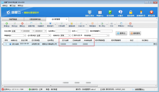 信管飛管理軟件專業(yè)版、標(biāo)準(zhǔn)版、星光版都支持錄入預(yù)付款,預(yù)付款是提前預(yù)付訂金,這種情況下貨物還沒有發(fā)出。如果還沒有形成相應(yīng)的訂單,這時我們可以直接錄入往來單位的預(yù)付款。下面我們以信管飛軟件為例來演示一下具體的操作步驟。 已支付供應(yīng)商采購預(yù)付款10萬元,供應(yīng)商退回5萬元該如何在系統(tǒng)里面登記呢?首先在應(yīng)付款管理界面找到登記的預(yù)付款記錄,如圖所示: 在付款結(jié)算單界面單獨(dú)結(jié)算這一筆采購預(yù)付款的賬單,付款金額錄入-50000元,可以在備注項(xiàng)錄入供應(yīng)商退回以便后續(xù)