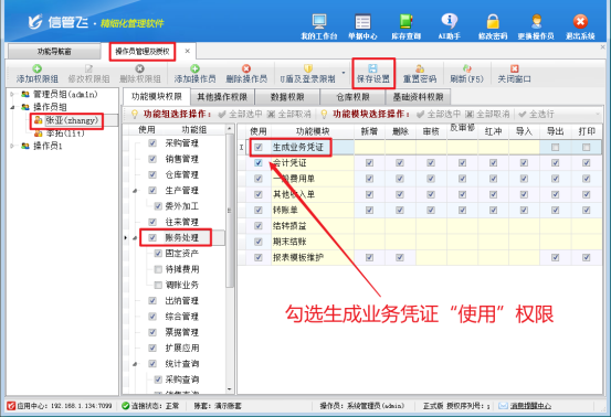 信管飛RMS專業(yè)版包含財(cái)務(wù)處理模塊,支持用戶高效、準(zhǔn)確地登記會計(jì)憑證,為企業(yè)的財(cái)務(wù)管理提供堅(jiān)實(shí)的數(shù)據(jù)基礎(chǔ)。在實(shí)際使用過程中,部分用戶反饋,當(dāng)使用操作賬號登錄軟件進(jìn)行賬務(wù)處理時,界面中未顯示生成業(yè)務(wù)憑證模塊,而系統(tǒng)管理員賬號登錄后該模塊卻能正常顯示,這是因?yàn)椴僮鲉T沒有生成業(yè)務(wù)憑證權(quán)限導(dǎo)致的,本篇文章介紹下如何解決? 首先系統(tǒng)管理員賬號登錄,點(diǎn)擊“系統(tǒng)管理”—》“操作員及授權(quán)”進(jìn)入操作員管理及授權(quán)界面,選擇操作員“張亞”,點(diǎn)擊功能模塊權(quán)限,選擇賬務(wù)處理,勾選“生成業(yè)務(wù)憑證”模塊,勾選后點(diǎn)擊保存,如圖: