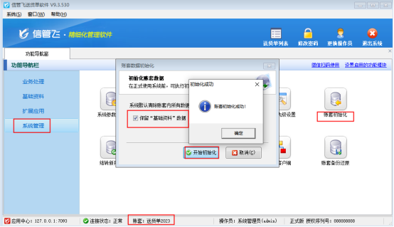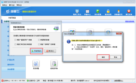此文章演示視頻觀看鏈接:信管飛rms賬套初始化演示視頻 賬套初始化一般用于在正式使用軟件前,對賬套中的數據進行初始化,以便重新錄入數據。也可以在開賬后,發現期初數據有問題時,對數據進行初始化,以便重新開始錄入期初。賬套數據初始化后,會直接刪除相應的數據,因此務必提前做好備份,謹慎操作! 進銷存軟件、信管飛倉庫管理軟件、信管飛送貨單軟件、信管飛出納記賬系統中都可以進行賬套初始化,下面我們以進銷存軟件為例來演示一下具體的操作步驟。