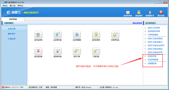演示視頻觀看鏈接:http://www.mchost.com.cn/news/video/202301/1857.html 信管飛送貨單軟件支持送貨年度匯總功能,可統計出年度內每個商品總銷售數量以及總銷售金額,另外也支持按客戶(業務員)統計匯總年度內每個客戶(業務員)的總銷售合計金額,如下圖所示。 如果不希望員工賬號登錄查看年度匯總統計功能,需要設置一下操作員權限,本文示范一下具體操作步驟。 用系統管理員賬號登錄軟件,在功能導航窗點擊“系統管理”—》“操