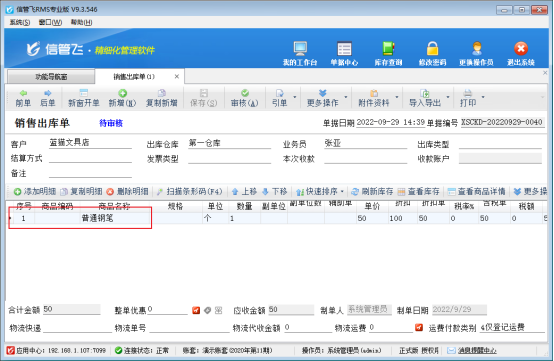 此文章相關演示視頻:如何設置新開送貨單時添加商品后自動增加新行演示視頻 信管飛RMS軟件、信管飛倉庫管理軟件、信管飛送貨單軟件等都支持開單直接添加商品明細,部分用戶在剛開始使用軟件時,開單添加一個商品后,不清楚如何在單據明細內繼續增加新的商品信息,如下圖所示,此問題在鍵盤上面按方向下鍵即可在單據明細中增加一行新行,另外軟件也支持設置在單據明細中添加商品后自動增加新行,本文以信管飛RMS軟件為例介紹下新開單據添加商品后自動增加新行如何設置? 在功能導航