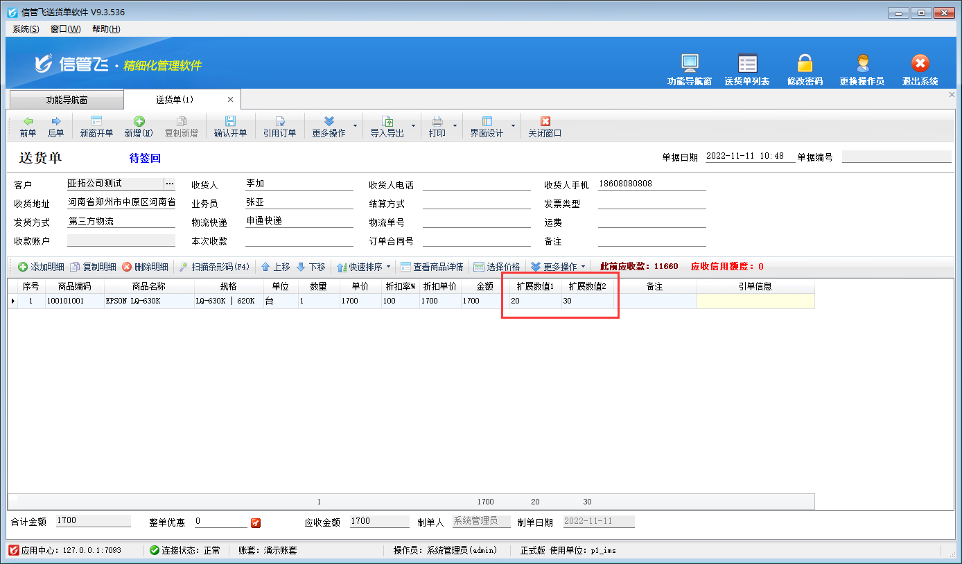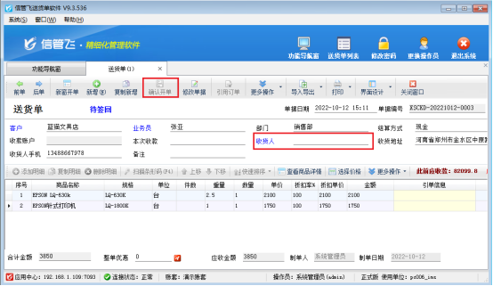 信管飛送貨單軟件、信管飛rms、信管飛倉庫管理軟件等支持開銷售單錄入收貨人信息,便于查詢單據商品是哪位客戶收到的貨物。也有客戶不需要開單時候輸入收貨人,對于不需要錄入收貨人信息的需求,軟件設置是否為必填項來進行控制收貨人是否為空顯示。 以送貨單軟件為例,示范下如何設置開單收貨人允許為空。送貨單界面設置收貨人是必填項,正常開送貨單,未在單據主體中輸入“收貨人”,商品輸入完成后點擊確認開單按鈕,會提示“收貨人不能為空”,如下圖1所示:圖1 在送貨單開單界面—》界面設計