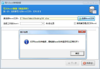 信管飛RMS、信管飛送貨單軟件、信管飛出納記賬系統都支持通過Excel導入數據,通過Excel數據導入可以將數據方便快捷的導入到軟件中,省去了使用初期大量的數據的錄入所要消耗的時間及人力物力,并避免人為錄入造成的誤差,使數據的錄入簡單、準確、高效。導入Excel數據時,如果是Excel2007以上版本的格式文件(.xlsx),系統提示:打開Excel文件錯誤,請檢查Excel文件是否可以打開。如下圖所示: 出現這種問題的原因是excel文件不兼容,處理方式有兩種:第一,將Excel文件用Excel