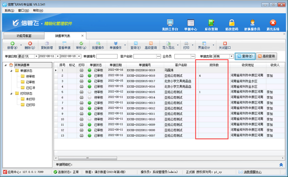 信管飛RMS在新增業務單據時支持增加文檔、圖片等附件資料,可更清晰的管理每筆出入庫單據的原始憑據。為了方便更直觀的查看業務單據是否添加附件,以及每筆單據添加的附件數量,軟件在采購銷售單列表以及訂單列表增加“附件數”數據列,用于顯示單據附件資料數。 以銷售單列表為例,配置下如何查看銷售單附件數,在銷售單列表工具欄點擊“界面設計”打開界面設計窗口,找到“附件數”數據項,并勾選顯示出來,如下圖所示。 設置完成后,在銷售單列表即可查看銷售單附件數量,如下圖所示,附件數為空,說明此單不存在附件。