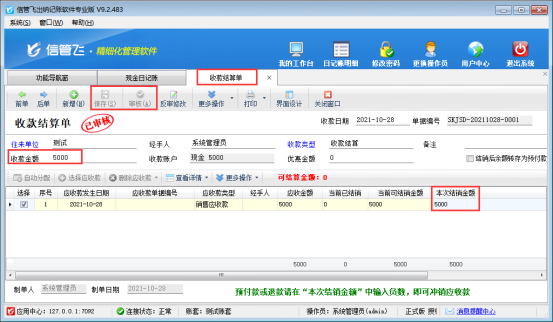 信管飛出納記賬軟件是集出納日記賬、應收應付款管理、發(fā)票管理為一體的軟件,軟件支持登記客戶的應收應付款時直接轉(zhuǎn)記出納憑證,后期實際收款支持在出納日記賬界面進行核銷結(jié)算。本文以應收款管理的結(jié)算進行示范。 功能導航窗“往來管理”—》“應收款管理”中,新增一筆客戶“測試”的應收款記錄,應收金額5000元,保存并轉(zhuǎn)記現(xiàn)金憑證,如下圖所示: 日記賬轉(zhuǎn)記完成后,可在功能導航窗“出納管理”—》“現(xiàn)金日記賬”中查看到憑證號為001的憑證記錄。后期客戶實際付款需要對此筆