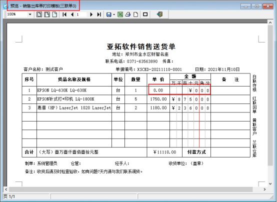 信管飛送貨單軟件等支持自定義設計打印模板,送貨單軟件中自帶了十幾種打印模板樣式,默認打印模板格式在打印金額和單價為0的時候不顯示零值,空白顯示,如下圖所示: 有用戶需要當單價為0時,打印模板上顯示出0值,本文以送貨單軟件為例,示范下如何取消隱藏零值設置,在送貨單開單界面打印下選擇“打印格式設計”。選擇需要修改的模板,點擊“設計格式”,進入模板設計器界面。選擇明細欄的“單價”文本框,鼠標點擊右鍵,在“隱藏零值”處單擊下,取消勾選符號,然后保存模板就可以。如下圖所示:
