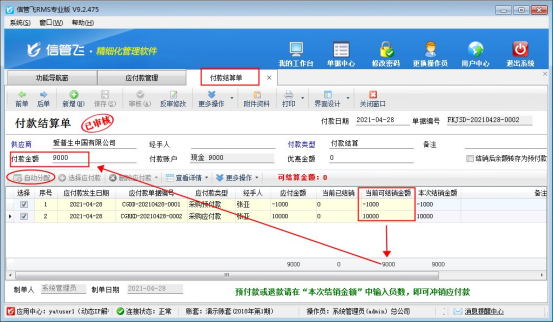 信管飛RMS星光版、標(biāo)準(zhǔn)版、專業(yè)版支持把采購貨品付部分定金給供應(yīng)商的金額錄入到軟件中,在實(shí)際付款給供應(yīng)商的時(shí)候可以扣除預(yù)付的定金金額,本文以“信管飛RMS專業(yè)版”為例示范下采購預(yù)付款如何沖抵采購應(yīng)付款? 首先需要新增客戶的預(yù)付款,有兩種方式: ①付給供應(yīng)商的定金,可直接開采購訂單時(shí)輸入在預(yù)付訂金中。②直接在收款結(jié)算單界面新增采購預(yù)付款。 本文以方式①為例,