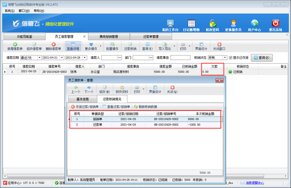 出納記賬軟件專業(yè)版的員工借款管理及還款管理功能可以對企業(yè)員工借款、還款進(jìn)行流程化登記管理,提高 了企業(yè)管理效率。本篇文章介紹一下出納記賬軟件報(bào)銷金額大于借款金額,需要給員工退款的情況下,軟件內(nèi)如何處理? 如下圖所示,員工“張偉”借款金額為5000元,費(fèi)用報(bào)銷了6000元,報(bào)銷金額大于借款金額,導(dǎo)致欠款-1000元,需退還給員工。這種情況下,需做還款單,進(jìn)行還款處理,將欠款金額清零。 在功能導(dǎo)航窗,點(diǎn)擊“綜合管理”—》“還款單管理”打開還款單管理界面,新增還款單,選擇還款人,
