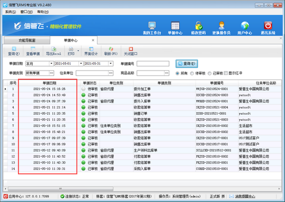 信管飛RMS是集采購管理、銷售管理、庫存管理、往來應(yīng)收應(yīng)付款等一體化的進(jìn)銷存管理軟件,軟件支持單據(jù)中心功能,在單據(jù)中心內(nèi)可以查詢到軟件內(nèi)所填開的所有業(yè)務(wù)單據(jù),可以根據(jù)單據(jù)日期、單據(jù)編號、單據(jù)類別、往來單位、商品名稱、審核狀態(tài)等信息查詢所需單據(jù),查詢結(jié)果默認(rèn)是根據(jù)單據(jù)日期正序顯示,如下圖所示。 如需設(shè)置單據(jù)中心按單據(jù)日期倒敘顯示,優(yōu)先顯示最新日期的單據(jù),也可以在系統(tǒng)參數(shù)配置中啟用參數(shù)“單據(jù)中心按單據(jù)日期倒敘顯示”,如下圖所示,在功能導(dǎo)航窗點(diǎn)擊“系統(tǒng)管理”—》“系統(tǒng)參數(shù)配置”—》“業(yè)務(wù)參數(shù)”打開業(yè)務(wù)參數(shù)配置界面,將查詢統(tǒng)計(jì)參