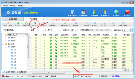 信管飛出納記賬軟件專業版包括工資管理功能,支持自定義工資模板管理員工工資單,可根據設置的工資模板快速生成工資單,支持從上月工資單復制工資項目數據。為了避免操作員刪除工資單,軟件中可以設置操作員不可刪除工資記錄權限。下邊我們在軟件中示范下設置操作員不可刪除工資記錄權限的操作步驟。 登錄軟件,在功能導航窗點擊“系統管理”—》“操作員及授權”,進入“操作員管理及授權”界面,選擇操作員“張亞”,在其右側的功能模塊權限內選擇“綜合管理”模塊,將工資單管理的“刪除”權限取消勾選,然后保存設置,如下圖所示。 &n