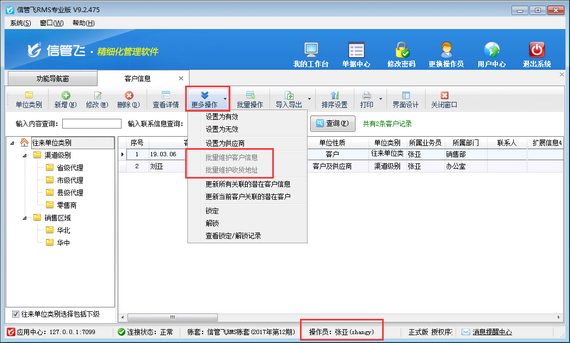 信管飛RMS、信管飛送貨單軟件、信管飛倉庫管理軟件等都支持批量維護客戶信息,可批量維護客戶信息的名稱、聯系人、電話、地址等信息。另外軟件中也支持設置操作員不可批量維護客戶信息,本篇文章我們以進銷存軟件為例詳細介紹一下如何設置操作員不可批量維護客戶信息? 在功能導航窗點“系統管理”—》“操作員及授權”即可進入“操作員管理及授權”界面,選中操作員賬號,在“其他操作權限”界面將“可批量維護客戶信息”權限打鉤取消,然后保存權限設置,如下圖所示,設置操作員張亞沒有“可批量維護客戶信息”權限。 設