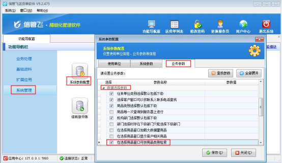 信管飛倉庫管理軟件、信管飛RMS(進銷存軟件)都包含倉庫管理功能模塊,為了在開單時更清晰地看到商品的庫存信息,軟件已實現業務單據開單時,在選擇商品窗口點擊“商品名稱”列可顯示商品庫存信息及采購價。下面我們以信管飛倉庫管理軟件為例介紹下如何設置在選擇商品窗口點擊商品名稱可顯示庫存信息。 演示視頻觀看鏈接:如何設置在選擇商品窗口點擊商品顯示庫存信息? 在功能導航窗,點擊“系統管理”—》“系統參數配置”—》“業務參數”,即可進入到“業務參數”配置界面,在“數據選擇參數”內打鉤啟用