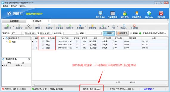 信管飛出納記賬軟件、信管飛RMS標(biāo)準(zhǔn)版和專業(yè)版都支持設(shè)置操作員不可查看已審核的出納日記賬憑證,本篇文章以信管飛出納記賬軟件專業(yè)版為例詳細(xì)介紹一下如何設(shè)置操作員不可查看已審核的出納日記賬憑證。 在功能導(dǎo)航窗點(diǎn)擊“系統(tǒng)管理”→“操作員及授權(quán)”即可進(jìn)入“操作員管理及授權(quán)”界面,選中操作員賬號(hào),然后在“其他操作權(quán)限”界面將“不可查看已審核的出納日記賬憑證”權(quán)限勾選上,如下圖所示,設(shè)置操作員賬號(hào)“張亞”不可查看已審核的出納日記賬憑證。 設(shè)置完成之后,我們分別使用系統(tǒng)管理員賬號(hào)和操作員賬號(hào)登陸軟件