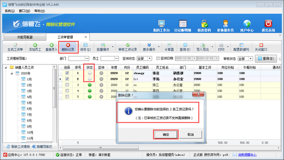 信管飛出納記賬軟件專業(yè)版包括工資管理功能,支持自定義工資模板,可根據(jù)設(shè)置的工資模板快速生成工資單,支持從上月工資單復(fù)制工資項(xiàng)目數(shù)據(jù),工資記錄審核后,無法直接刪除,如下圖所示,如確定需要?jiǎng)h除,需要反審到未審核狀態(tài),然后在執(zhí)行刪除操作,本文介紹一下出納記賬軟件中如何刪除已審核的工資記錄? 演示視頻觀看鏈接:出納記賬軟件中如何刪除已審核的工資記錄演示視頻 在功能導(dǎo)航窗點(diǎn)擊“綜合管理”—》“工資單管理”,打開工資單管理界面,在工資記錄列表中打鉤選擇要反審的工資記錄,然后點(diǎn)擊“更多操作”—》“反
