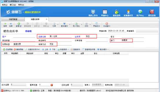 在企業的經營管理過程中,為了快速開單,提高效率,有時需要對單據設置默認值。 信管飛倉庫管理軟件業務單據的界面分為單據主體及單據明細兩部分,如圖1所示,單據默認值功能是對單據主體的部分數據項進行設置默認值,業務單據設置默認值后,每次新增單據時會顯示已設置的數據項默認值。圖 1 下面我們以信管飛倉庫管理軟件為例詳細介紹下如何設置單據默認值。 登錄軟件,在功能導航窗點“銷售管理”—》“銷售出庫單”,進入新開銷售單界面,如圖2所示,點擊“更多操作”按鈕,點擊