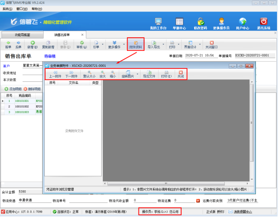 信管飛RMS(進銷存管理軟件)新增或者修改業務單據時,支持添加文檔、圖表等附件資料,可掃描或導入與業務單據相關的電子文件,方便用戶更全面、直接地查詢業務單據的全過程,有利于企業對業務單據的管理(如下圖所示)。為避免每個操作員都可以修改到業務單據的附件資料,軟件支持控制操作員的可修改附件資料權限。本文介紹一下如何設置操作員可查看但不可修改附件資料? 在功能導航窗點擊“系統管理”—》“操作員及授權”打開操作員管理及授權界面,選擇操作員“李拓”,在“其他操作權限”中,取消勾選“可修改附件資料”,勾選“可查看附件資料”,然后點擊