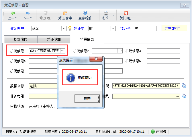 出納記賬軟件中默認不允許直接修改已審核憑證的擴展信息,但是如需修改已審核憑證的擴展信息,系統支持參數配置,如下圖所示,啟用參數:“可修改已審核憑證的擴展信息”,參數值可自定義,默認為“ext1,ext2(擴展信息1,擴展信息2)”,參數啟用后即可修改已審核憑證的擴展信息,但是如需普通操作員可修改已審核憑證的擴展信息,需要另外設置一下操作員權限,本文介紹一下如何設置操作員可修改已審核憑證擴展信息的操作權限? 在功能導航窗點“系統管理”→“操作員及授權”即可進入“操作員管理及授權”界面,選中操作員賬號,在“其他操作權限”界面