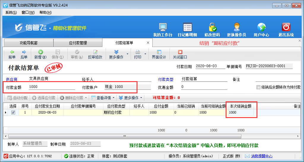 信管飛出納記賬軟件支持錄入供應商的期初應付款,期初應付款是指在使用軟件之前應付給供應商的金額,本文介紹一下軟件內錄入供應商期初應付款的操作方法。 在功能導航窗點擊“往來管理”—》“應付款管理”,即可打開應付款管理界面,在工具欄點擊“新增”按鈕,系統打開新增應付款窗口,如下圖所示,“應付類型”選擇為“期初應付款”,然后錄入應付金額及其他數據后保存此應付款信息即可。 保存后,應付款管理界面增加一條未結銷的期初應付款記錄,后續給供應商結款后,可以在軟件中結銷此期初應付款,選擇此條期初應付款記