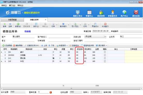 信管飛送貨單軟件、信管飛倉庫管理軟件、信管飛RMS開單時,當商品存在打折情況時,支持錄入商品的折扣率。當商品明細的內容比較多時,為了快速開單,提高效率,可以批量更新單據明細中的折扣率。下面我們以信管飛倉庫管理軟件為例詳細介紹下如何批量修改商品折扣率。 登錄軟件,在功能導航窗點“銷售管理”—》“銷售出庫單”,進入新開銷售單界面,錄入商品信息,默認的折扣率是100%,如圖1所示:圖 1 在單據明細上方,點擊“更多操作”—》“修改商品折扣”,彈出修改商品折扣率的窗口,輸入折扣(例如:8折優惠