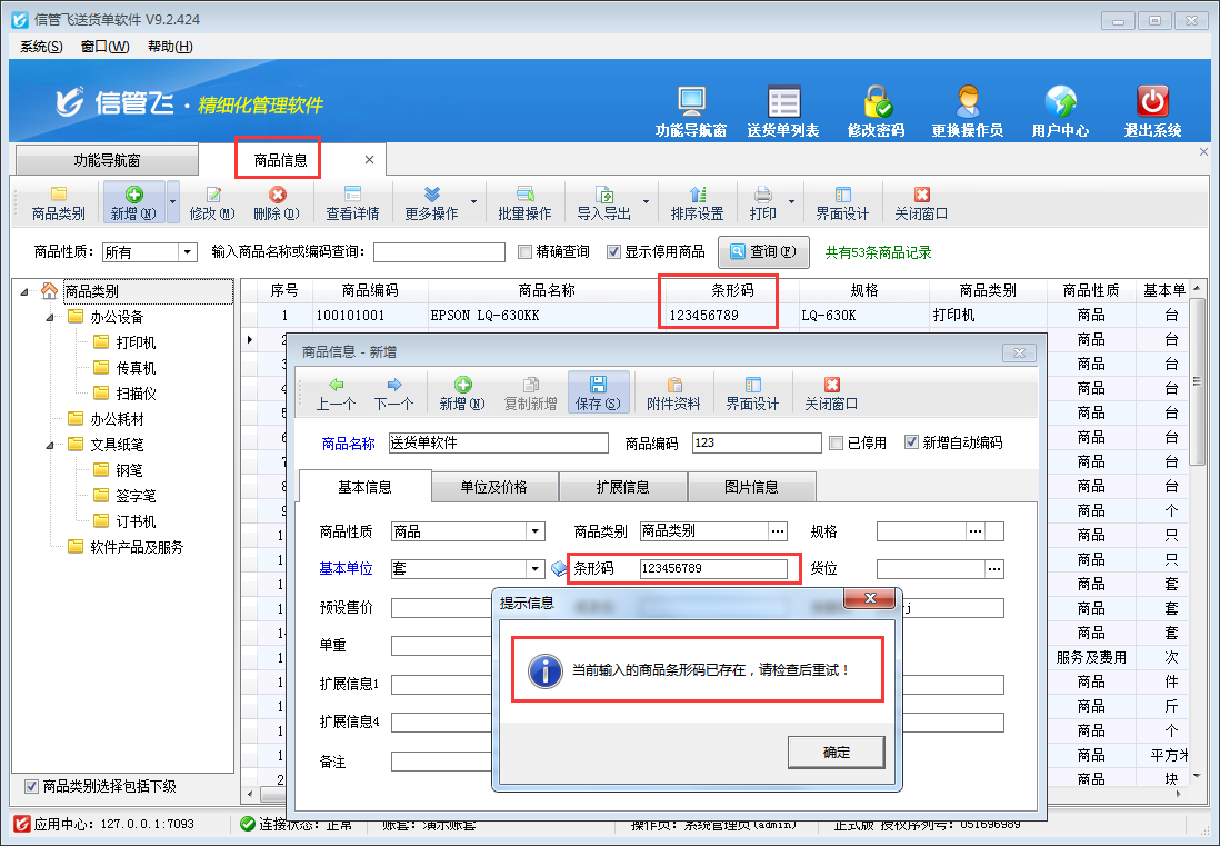 信管飛送貨單軟件支持通過掃描條形碼添加商品到單據明細進行快速開單,如開單需要使用掃描條形碼功能,需要提前在基礎資料—》商品信息中將每個商品的條形碼信息維護好,為了避免商品條形碼錄入重復,軟件支持參數設置商品條形碼不可重復,本文介紹一下如何設置商品條形碼不可重復。 在系統管理—》系統參數配置—》業務參數內將“數據可否重復參數”中的“商品條形碼可重復”參數的勾選取消,然后保存設置。如下圖所示: 設置完成后,在功能導航窗點擊“基礎資料”—》“商品信息”打開商品信息界面,新增一個商品
