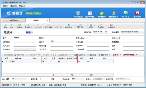 信管飛送貨單軟件、信管飛RMS標準版、專業版軟件支持多計量單位,可添加輔助單位,那什么是輔助單位呢?有的商品在銷售中可能按“包”,也可能是按“箱”進行銷售,存在多個不同的計量單位,此時在軟件中此商品就需要用到輔助單位,輔助單位,就是同一個商品存在多個不同的計量單位,這幾個單位之間存在一定的換算關系,不管是輸入哪一個單位,軟件都可以根據換算比例來自動進行換算轉換。 以送貨單軟件為例,示范下如何在軟件中新增商品的輔助單位。一、設置輔助單位及換算關系 在“
