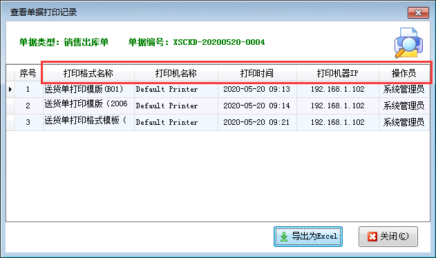 進銷存管理軟件支持自定義打印格式模板,可選擇不同打印模板進行打印單據,也可根據參數設置限制單據打印次數,跟蹤記錄單據每次打印情況,本篇文章介紹一下如何查看單據打印記錄? 在銷售出庫單界面工具欄點擊“打印”—》“查看單據打印記錄”可以打開查看單據打印記錄界面,如下圖所示,可以查看本單打印記錄,跟蹤記錄單據每次打印情況,如每次打印使用的打印格式模板、打印機名稱、打印時間及每次打印操作人員名稱等。 歡迎免費下載試用這款支持自定義打印格式模板且可選擇不同模板進行打印的進銷存管理軟件:信管飛RM