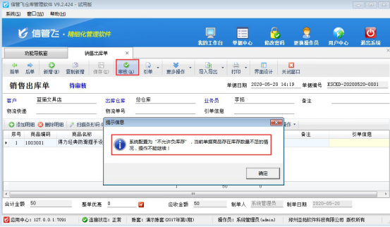 信管飛倉庫管理軟件、信管飛RMS軟件支持管理商品庫存,軟件默認是允許負庫存出庫,部分客戶需要設置商品沒有庫存的情況下不允許商品出庫(即不允許負庫存出庫),如何設置呢?本文以“信管飛倉庫管理軟件”為例,介紹下如何設置不允許商品負庫存出庫。 在功能導航窗點擊“系統管理”—》“系統參數配置”—》“業務參數”,進入“業務參數”配置界面,在庫存管理參數中找到參數“允許負庫存”,取消勾選符號,點擊“保存”,如下圖所示: 設置完成后,在功能導航窗點擊“銷售管理”