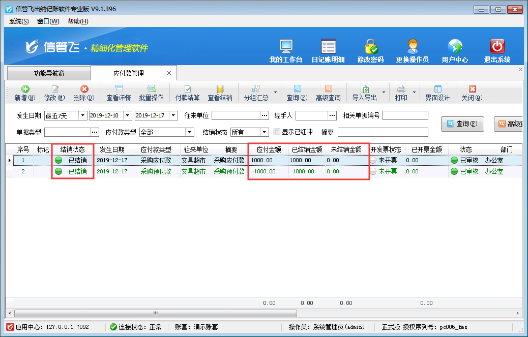 采購預付款是我們提前預付給供應商的金額,可以用來沖銷采購產生的應付款,本文以信管飛出納記賬軟件專業版為例演示一下如何使用采購預付款沖銷采購應付款? 在功能導航窗點擊“往來管理”—》“應付款管理”打開應付款管理界面,如下圖所示,在應付款管理內對同一個供應商分別新增一條應付款記錄,一條預付款記錄,結銷狀態為“未結銷”狀態,已結銷金額為0。 在應付款管理界面工具欄有“付款結算”按鈕,可以打開付款結算單對采購應付款/預付款進行付款結銷。如下圖所示,供應商“文具超市”應付金額1000元,采購預付