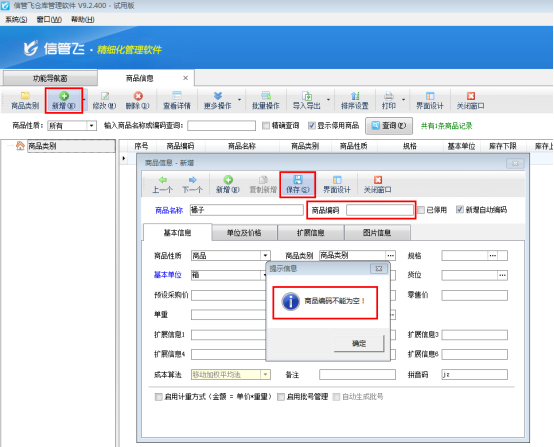 亞拓軟件自主研發的信管飛RMS(進銷存軟件)、信管飛送貨單軟件、信管飛倉庫管理軟件等都支持新增商品信息,為了避免增加的商品信息出現重復,軟件支持參數設置商品編碼不可重復。 以信管飛倉庫管理軟件為例,在系統管理—》系統參數配置—》業務參數內將“數據可否重復參數”中的“商品編碼可重復”參數的勾選取消,然后保存設置。如下圖所示:圖1 設置完成后,打開功能導航窗的“基礎資料”—》“商品信息”,新增一個商品,輸入和之前已增加過的商品一樣的編碼,保存時系統會提示“當前輸入的商品編碼已存在,請檢查后