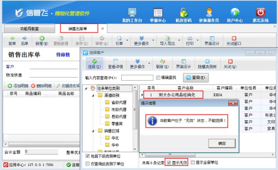 信管飛倉庫管理軟件是集采購管理、銷售管理、庫存管理為一體的進銷存管理軟件。經常會有用戶問到刪除客戶資料時會彈出提示信息:“當前選擇的往來單位在單據中有使用,不能刪除”(如下圖所示),刪除不了,為什么? 系統默認在單據中已使用過的往來單位信息是不能刪除的,因為如果刪除,則會影響之前已使用此往來單位信息所開的業務單據,對于此種情況,我們可以將需要刪除的往來單位設置為無效,本篇文章我們來介紹信管飛倉庫管理軟件內如何將客戶信息設置為無效? &nb